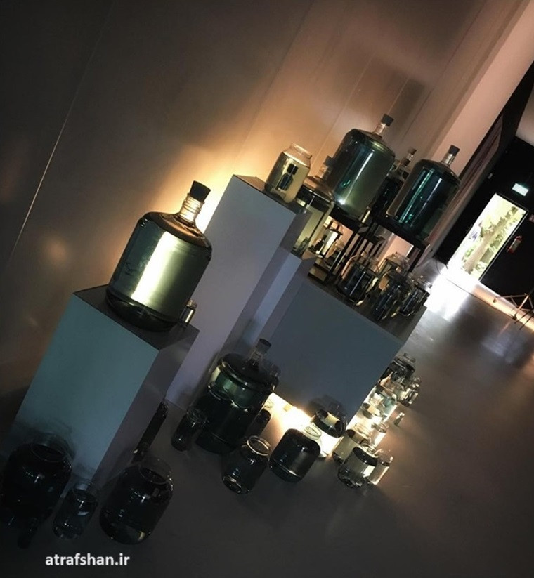 آب اقیانوس در بطری های شیشه ای در نمایشگاه مگامار در آمستردام